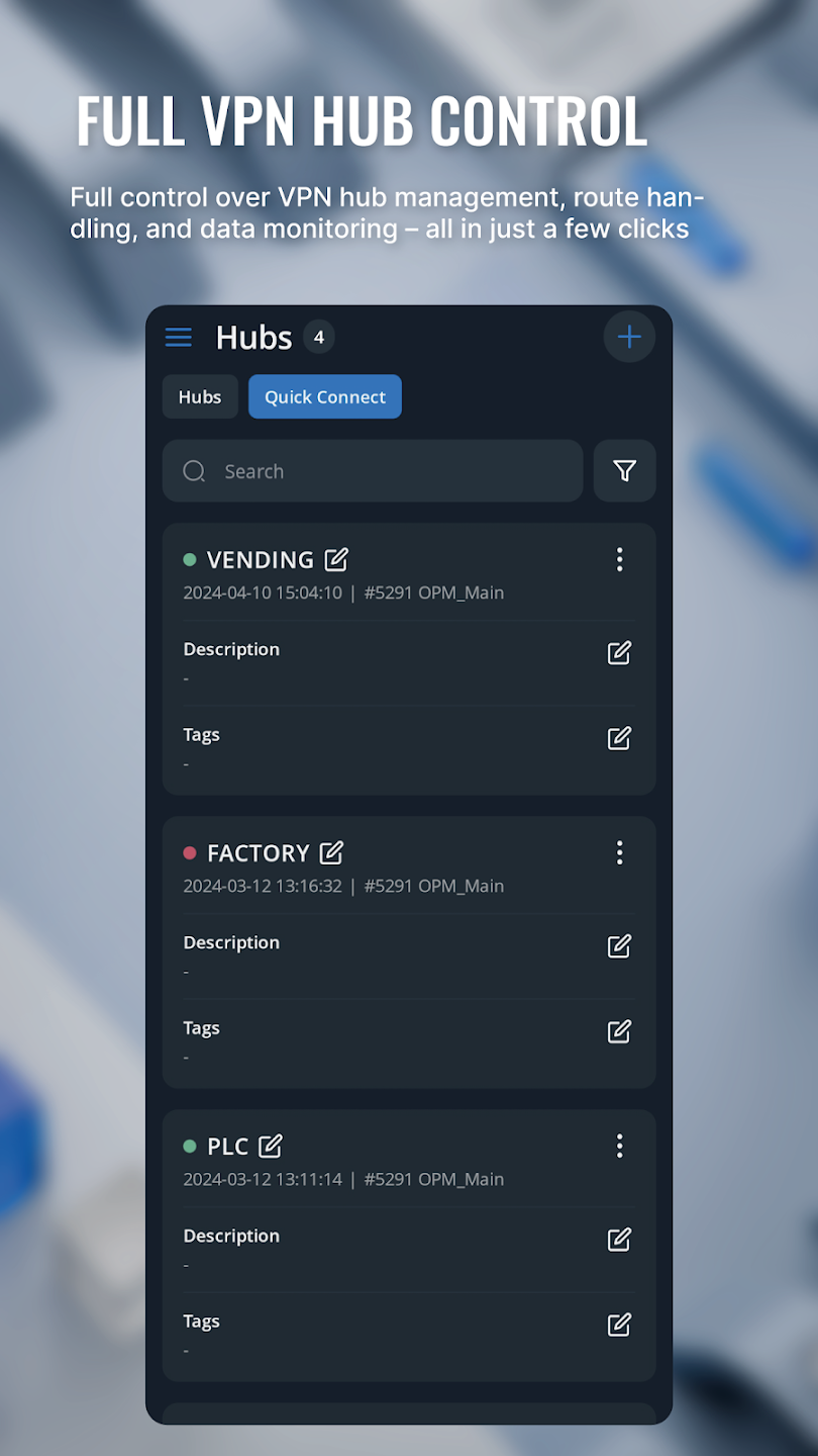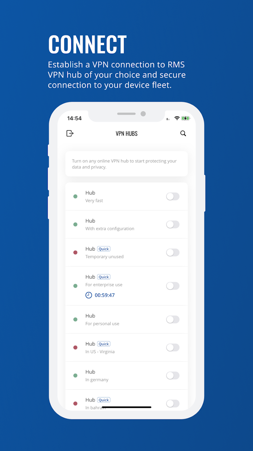 La aplicación RMS VPN lleva esta funcionalidad directamente a su dispositivo, permitiéndole establecer conexiones seguras a sus concentradores VPN preconfigurados o sesiones de Conexión Rápida con un solo paso. Puede autenticarse, seleccionar la conexión deseada y acceder a sistemas remotos en un instante. El concentrador VPN ofrece conectividad persistente multipunto, mientras que la Conexión Rápida proporciona sesiones rápidas y de tiempo limitado para diagnósticos rápidos y tareas puntuales.