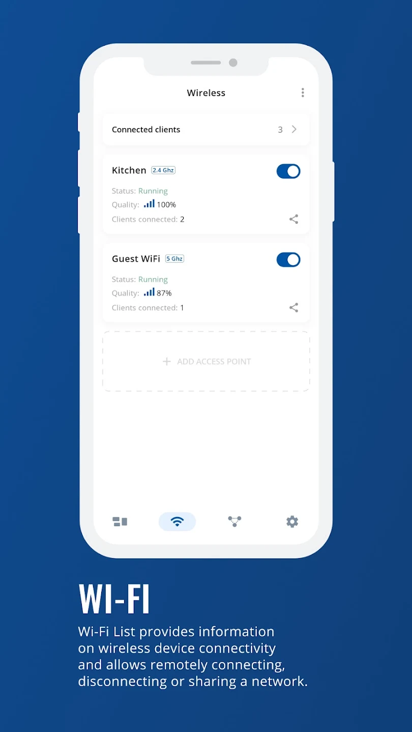 También puede explorar listas detalladas de dispositivos y conexiones inalámbricas para comprender cómo interactúa su equipo con la red. La sección Wi-Fi le permite revisar los clientes conectados, administrar el acceso inalámbrico y compartir detalles de la red cuando sea necesario. La lista de dispositivos le ayuda a evaluar la accesibilidad y la conectividad de un vistazo, brindándole información práctica sobre el rendimiento de su infraestructura.