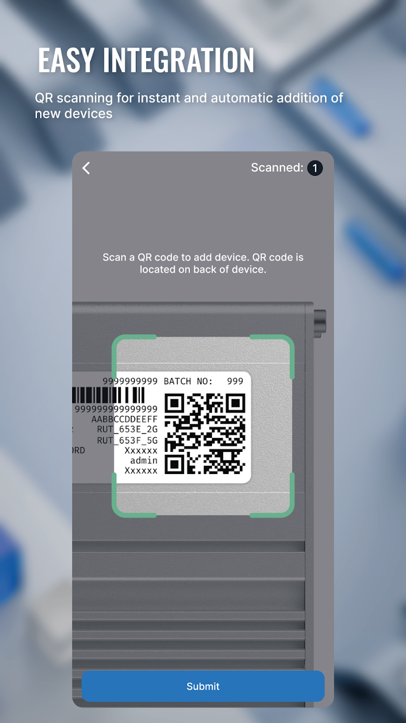 Agregar nuevos dispositivos es igualmente eficiente: puede registrar hardware escaneando códigos QR y también manualmente, lo que garantiza un flujo de trabajo de incorporación fluido en el campo.