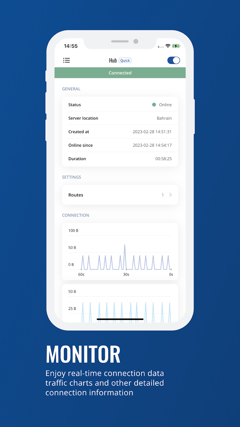 Tanto si trabaja desde un dispositivo Android como iOS , esta aplicación de Teltonika le permite ver el estado de la conexión, los detalles de enrutamiento, las rutas de tráfico reenviadas y la información del servidor. Esta información le proporciona una visibilidad operativa clara y le ayuda a mantener una experiencia fluida y controlada mientras trabaja en redes remotas. Quick Connect crea acceso temporal al producto, mientras que la VPN puede utilizarse en todo momento.