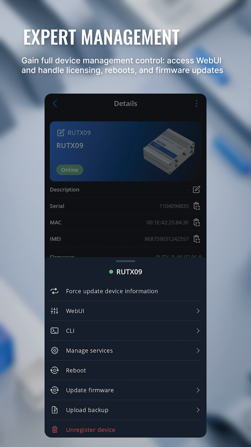 Además de la monitorización, la aplicación Teltonika RMS le permite interactuar directamente con su equipo. Puede acceder a las interfaces web del dispositivo de forma segura, iniciar sesiones remotas con equipos de terceros a través de RMS Connect mediante HTTP(S), SSH, RDP o VNC, gestionar actualizaciones de firmware , realizar reinicios y revisar el estado del dispositivo cuando sea necesario.