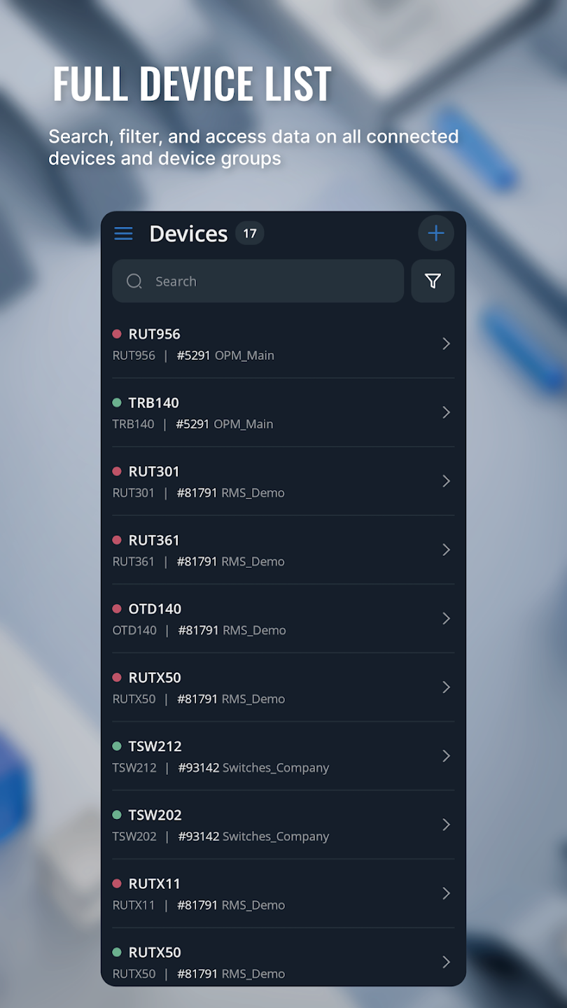 La aplicación Teltonika RMS ofrece todas las funciones del sistema de gestión remota directamente en su dispositivo móvil. Disponible para iOSand Android , proporciona acceso inmediato y en cualquier lugar a los equipos Teltonika y a dispositivos de terceros compatibles.