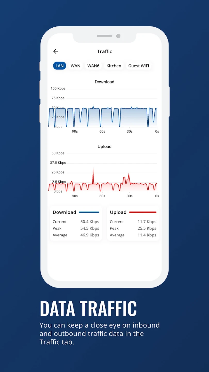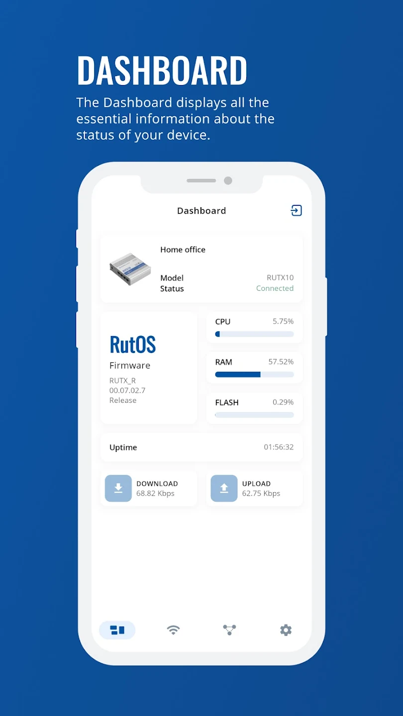 Estar al tanto del estado de tu red es muy fácil con la app RutOS, disponible tanto para Android como para iOS . Desde el momento en que la abres, el panel presenta información clave como el estado del dispositivo, el tiempo de actividad, la versión del firmware, el uso de memoria y la calidad de la conexión en tiempo real. Puedes seguir el rendimiento de internet mediante gráficos de tráfico que visualizan el comportamiento de carga y descarga, lo que te ayuda a evaluar la estabilidad de la red y a detectar rápidamente irregularidades.