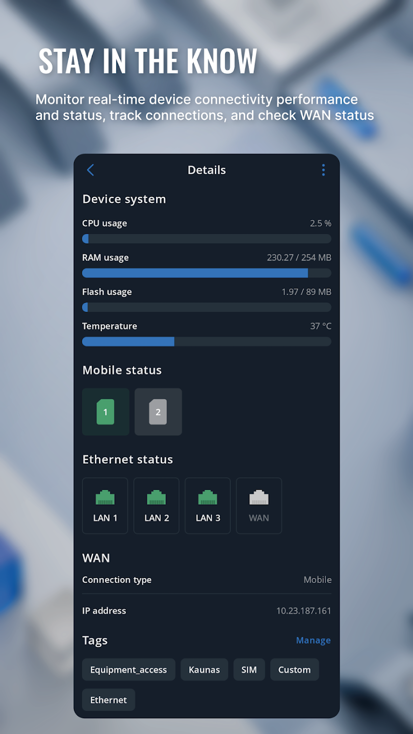 Esta aplicación de Teltonika ofrece una visibilidad clara del estado del dispositivo, los estados en línea y fuera de línea, la información de la WAN y otros parámetros clave, lo que le ayuda a detectar problemas antes de que afecten a las operaciones.