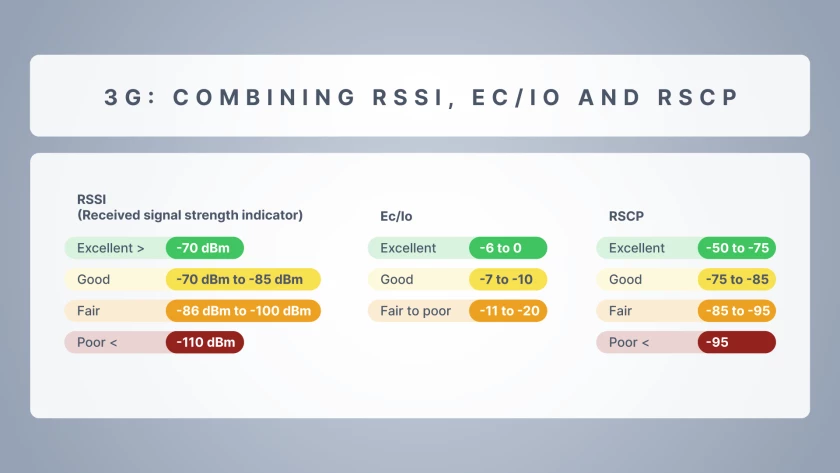 Al optimizar una configuración 3G, no confíe únicamente en el indicador de intensidad de la señal recibida (RSSI). Un RSCP fuerte combinado con un Ec/Io limpio garantiza una baja latencia, conexiones estables y un rendimiento de datos constante. Consulte la pestaña siguiente para obtener una visión completa de su conexión.