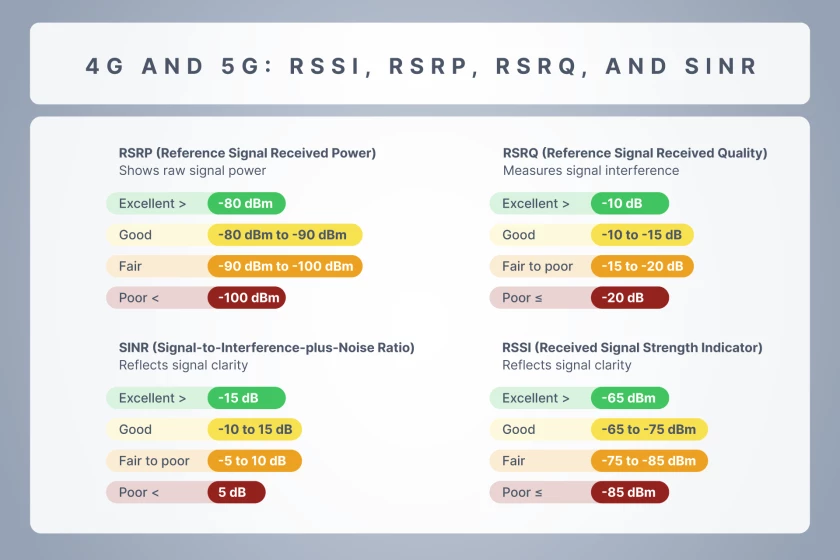 Para 4G y 5G, la intensidad y la calidad de la señal se miden utilizando cuatro indicadores principales. RSSI muestra la intensidad total de la señal 4G y 5G, pero incluye el ruido. RSRP mide la intensidad de la señal útil. RSRQ muestra la limpieza de la señal, como Ec/Io en 3G. SINR compara su señal con cualquier interferencia: cuanto mayor sea el SINR, más rápida y estable será la conexión a Internet.