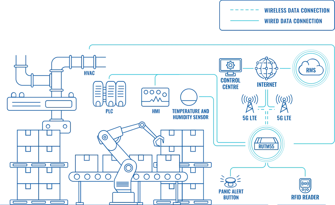 En esta configuración, el router 5G RUTM55 actúa como centro de conectividad, utilizando sus robustas capacidades 5G/4G, incluida la compatibilidad con LTE Cat 19, para establecer una conexión segura a Internet. A nivel local, el Gigabit Ethernet, RS232/RS485 y las E/S integradas del router eSIM RUTM55 permiten una integración directa y perfecta con una amplia gama de componentes industriales dentro de las instalaciones.