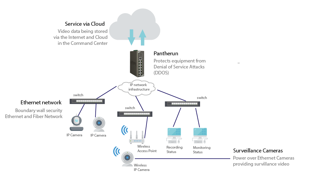 Después de un ataque de esta naturaleza, el gobierno indio decidió implementar una seguridad perimetral alrededor de una instalación de defensa crítica. Utilizaron una red compuesta por switches industriales Cisco, routers de capa 3 y cortafuegos para alimentar cámaras y transmitir contenido de video desde los muros de la instalación hacia el servidor en la nube. Esta infraestructura se estableció con un costo de 500,000 dólares estadounidenses. El diagrama de la red es el siguiente: