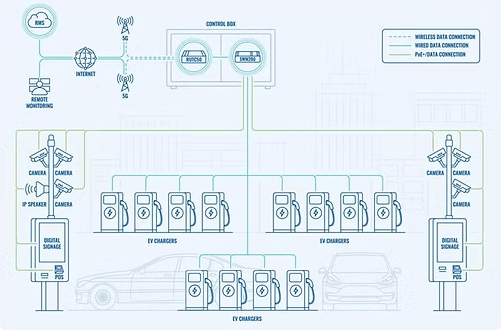 The mercado de la carga de vehículos eléctricos, en rápido crecimiento, requiere una infraestructura totalmente conectada capaz de admitir diversos dispositivos, como cámaras, terminales POS y señalización digital, al tiempo que garantiza un funcionamiento eficiente y que ahorra espacio.