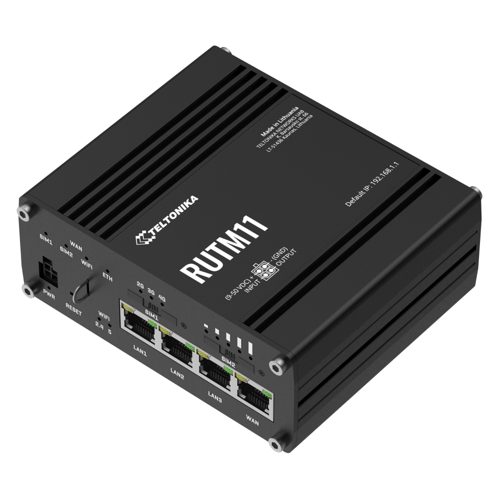 El RUTM11 es un router LTE industrial de Teltonika, diseñado para aplicaciones que exigen un alto caudal de datos y una conexión de red robusta con tolerancia cero a la alta latencia y las interrupciones. El RUTM11 viene equipado con cuatro puertos Gigabit RJ45, Wi-Fi de doble banda y doble SIM, lo que permite múltiples escenarios de conmutación por error. Este router cuenta con LTE Cat 6, lo que le permite alcanzar velocidades celulares de hasta 300 Mbps, que pueden aumentarse con la agregación de portadoras.