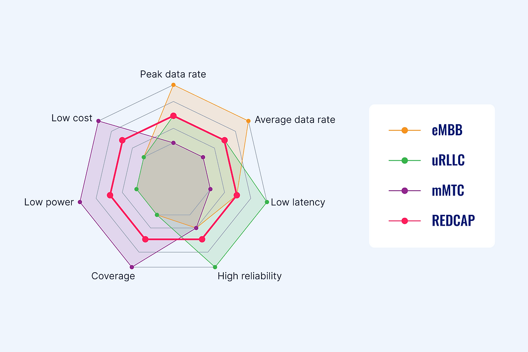 La respuesta es 5G NR-Light, también conocido como RedCap 5G. No, no son las setas, ni siquiera los duendes anglo-escoceses, sino Capacidad Reducida 5G. En esencia, RedCap 5G ocupa un espacio más flexible entre las divisiones de 5G NR comentadas anteriormente.