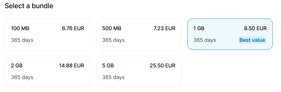 Sí, en el portal del proveedor del servicio puedes escoger entre varias recargas de diferentes volúmenes de datos, unos por encima y otros por debajo. A continuación puedes ver las opciones disponibles para una tarjeta SIM con 1GB de datos. Lo que no es posible es modificar la duración de la tarjeta, es decir, si tenemos una tarjeta de 1 año no podemos recargarla con una duración diferente, como por ejemplo, 5 años.